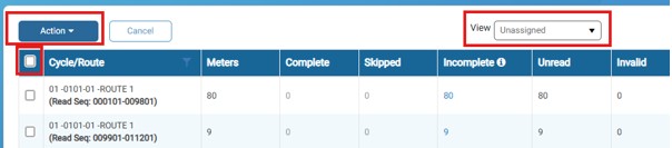 1. To select multiple routes at one time, verify that the View field has the Unassigned option selected, and then click the box in the header that appears under the Action button to select all routes in the grid. You can deselect any boxes, if desired.